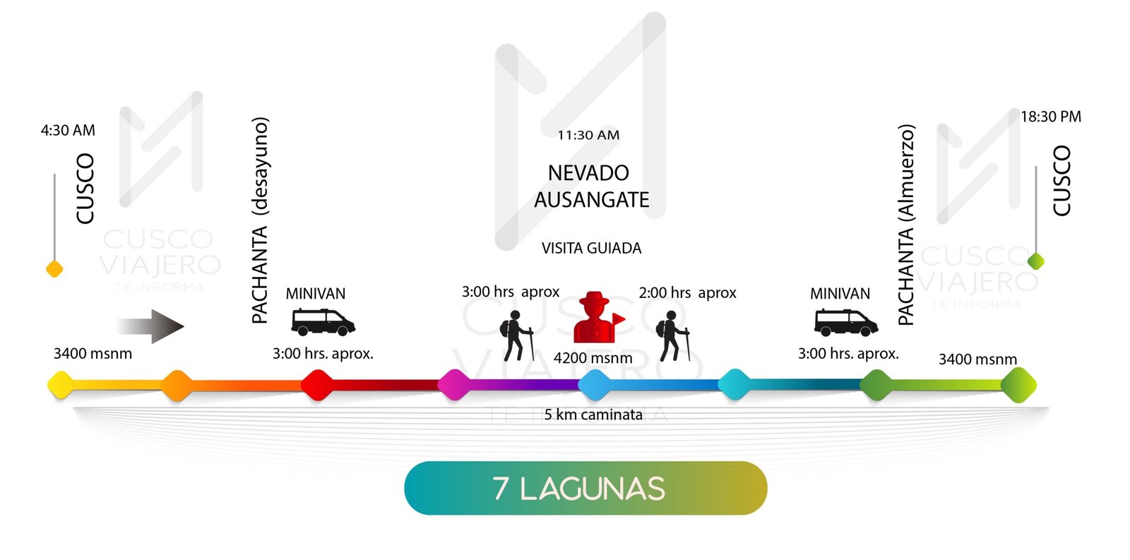08:30 am Inicio de la caminata guiada por el circuito de las 7 lagunas.